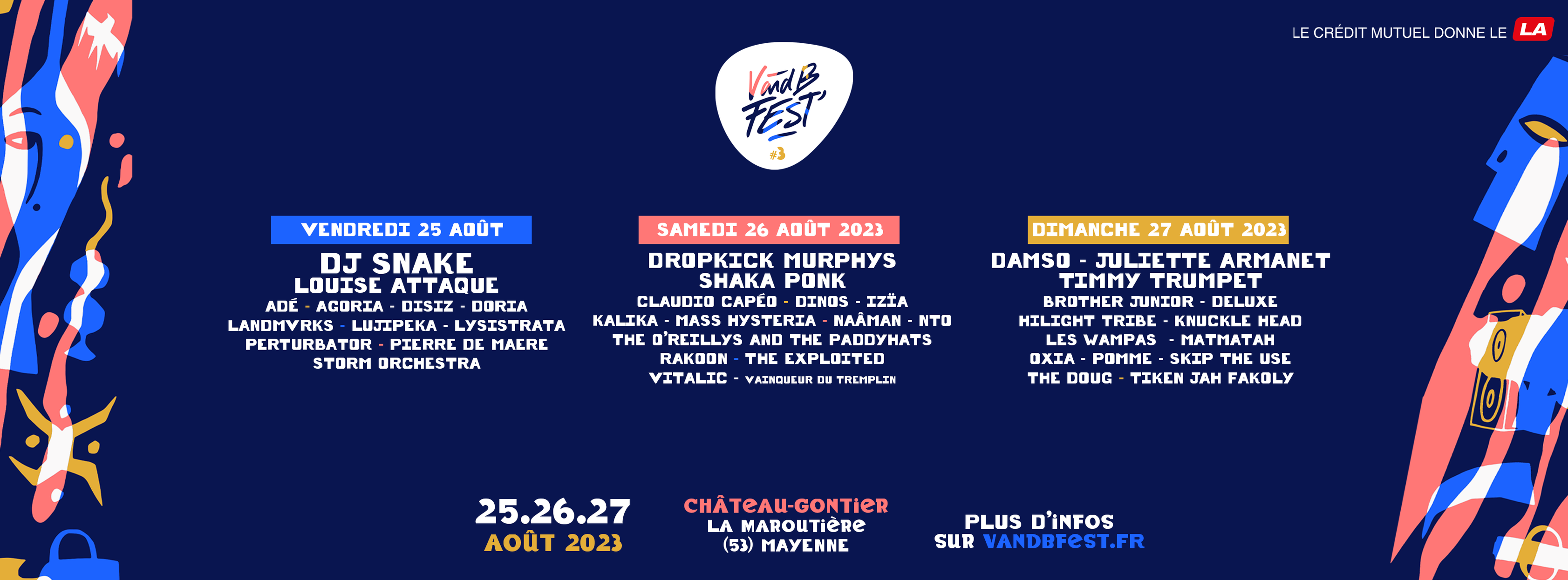 Du 25 au 27 août 2023, le V and B Fest revient à Château-Gontier sur Mayenne ! Et le programme s’annonce bien chargé, puisqu’on y retrouvera DJ Snake, NTO, Vitalic, Timmy Trumpet ou encore Agoria. On vous donne tous les détails !