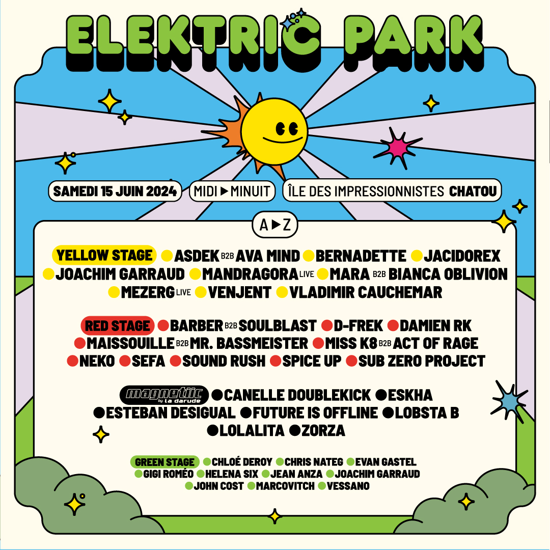 On a désormais la programmation complète de Elektric Park 2024, avec le détail des 5 scènes présentes. Premièrement, l’apparition d’une « Green Stage » by Joachim Garraud. Le fondateur y regroupe son entourage, et compte y jouer également, en plus de son habituel set à la Yellow Stage. Celle-ci, faisant office de Main Stage, accueillera entre autre Vladimir Cauchemar, Mandragora, Mezerg, ou encore Asdek B2B Ava Mind. On est également très curieux à l’idée du Mara B2B Bianca Oblivion.