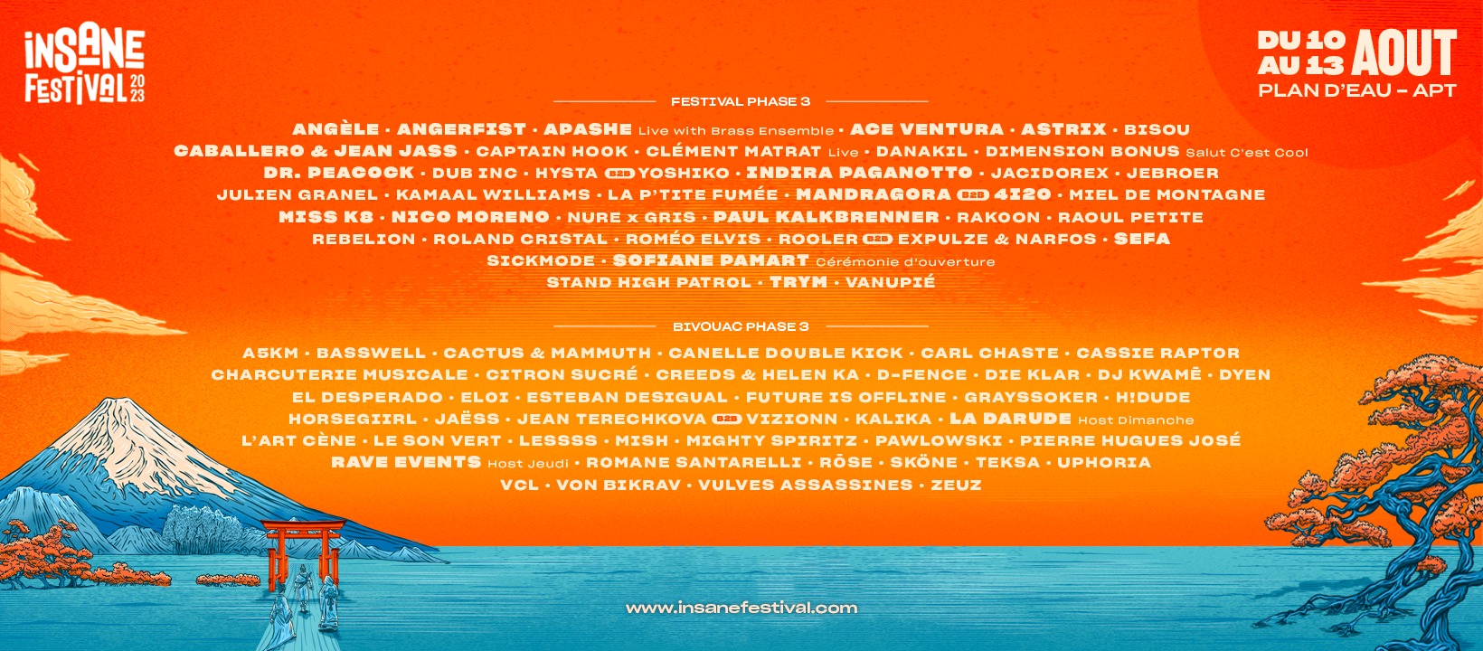 Wow ! L’Insane Festival a dévoilé une programmation 2023 à couper le souffle. Voir des têtes d’affiche comme Angèle, Paul Kalkbrenner ou encore Apashe fait grandement plaisir ! Mention spéciale pour la scène Hardcore qui se voit bien représentée le vendredi.