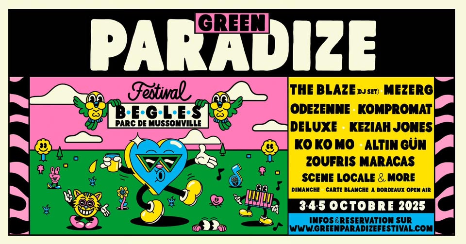 Le Green Paradize vous donne rendez-vous du 3 au 5 octobre prochain au Parc de Mussonville à Bègles pour une aventure musicale inoubliable ! Trois jours de fête, de partage et de surprises, dans un cadre idyllique. Petit aperçu de la programmation :