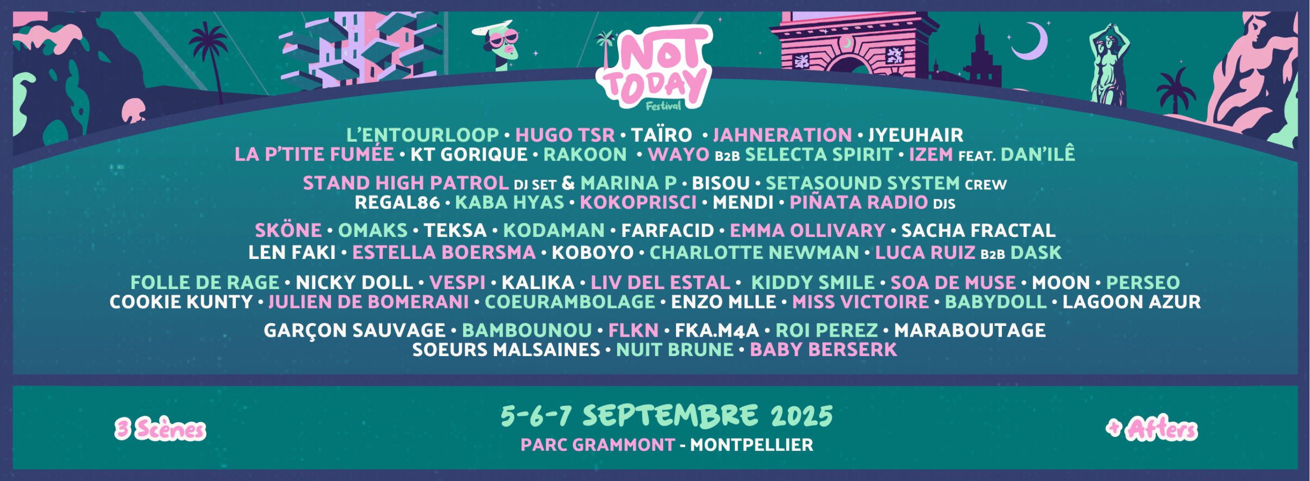 Le Not Today Festival s’impose comme un festival innovant et déjanté au cœur de l’été ! En 2025, il se tiendra sur trois jours, du 5 au 7 septembre, dans le verdoyant Parc Grammont de Montpellier. Avec ses trois scènes — live, techno et locale —, le festival mêle concerts, DJ sets, performances et cartes blanches à des collectifs locaux !