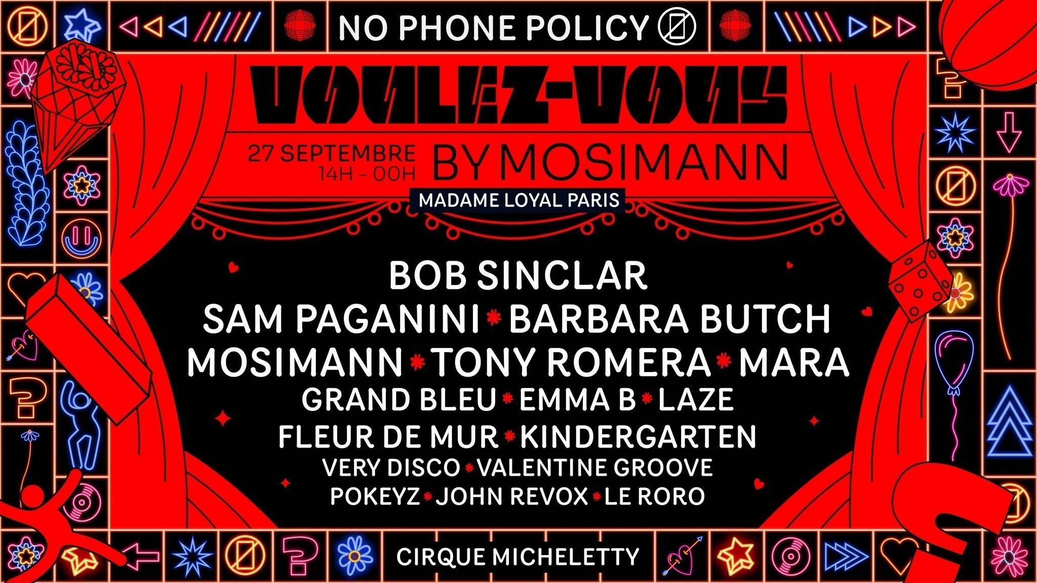 Madame Loyal invite Mosimann pour une carte blanche déjantée autour de son concept VOULEZ-VOUS. Pour l’occasion, il réunit une sélection d’artistes de tous les horizons : house, disco, techno, bass house, et des surprises tout au long de la journée. Rendez-vous le Samedi 27 septembre au Cirque Micheletty pour 10h de fête entre shows spectaculaires, DJs iconiques, scénographies décalées et fête foraine magique !