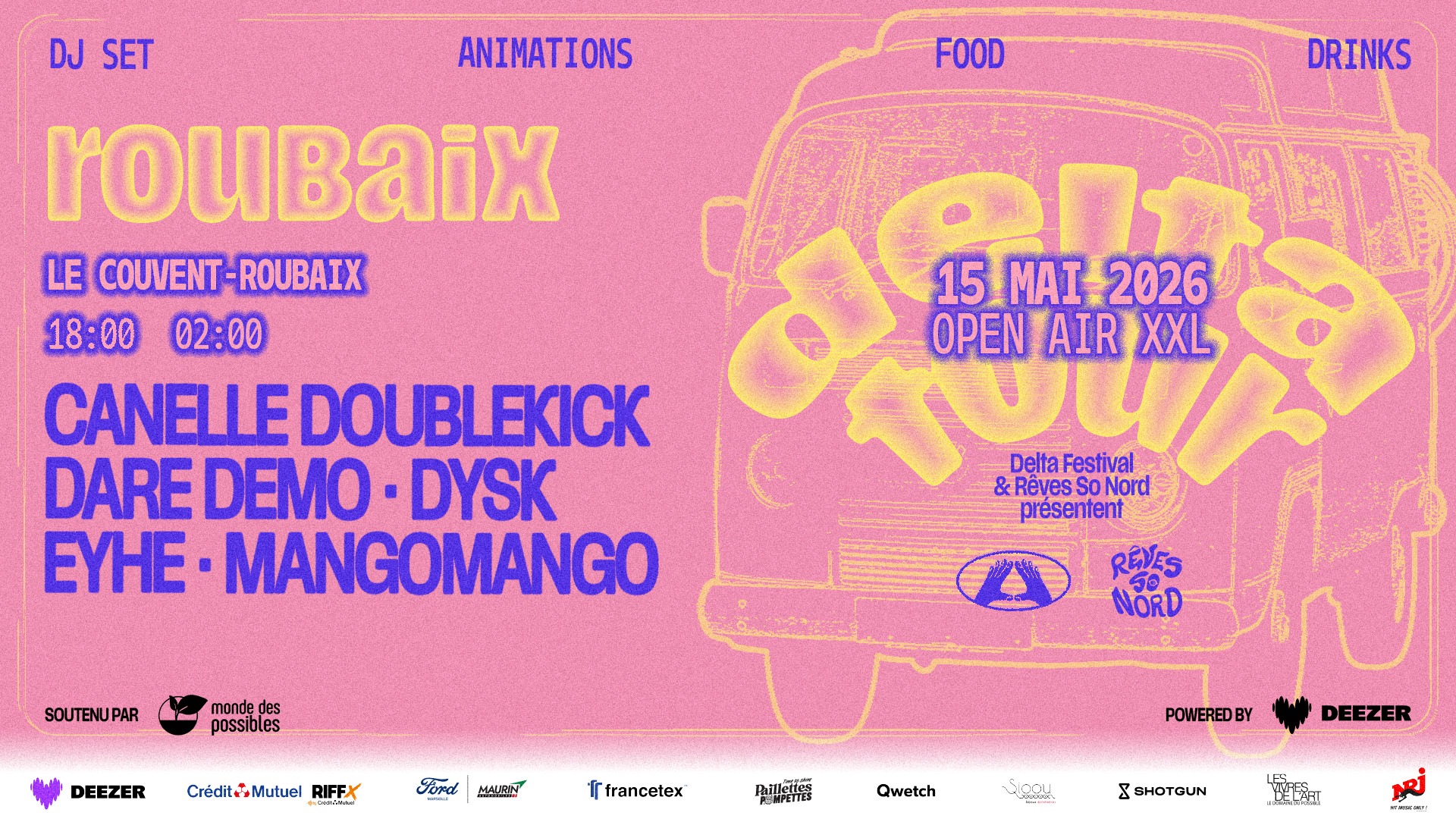Le Delta Tour reprend de plus belle pour une édition 2026 XXL. Soleil, good vibe & accent chantant … on ramène un peu de Marseille dans 21 VILLES !! Au programme : Open Air & Club, DJ Set, Animations, Karaoké by Deezer, Stands, Paillettes, Food & surprises dans une ambiance guinguette Un avant-gout de l’ambiance du Delta Festival, mais chez toi ! Le Delta Tour débarque à Roubaix, en collaboration avec Rêves So Nord !