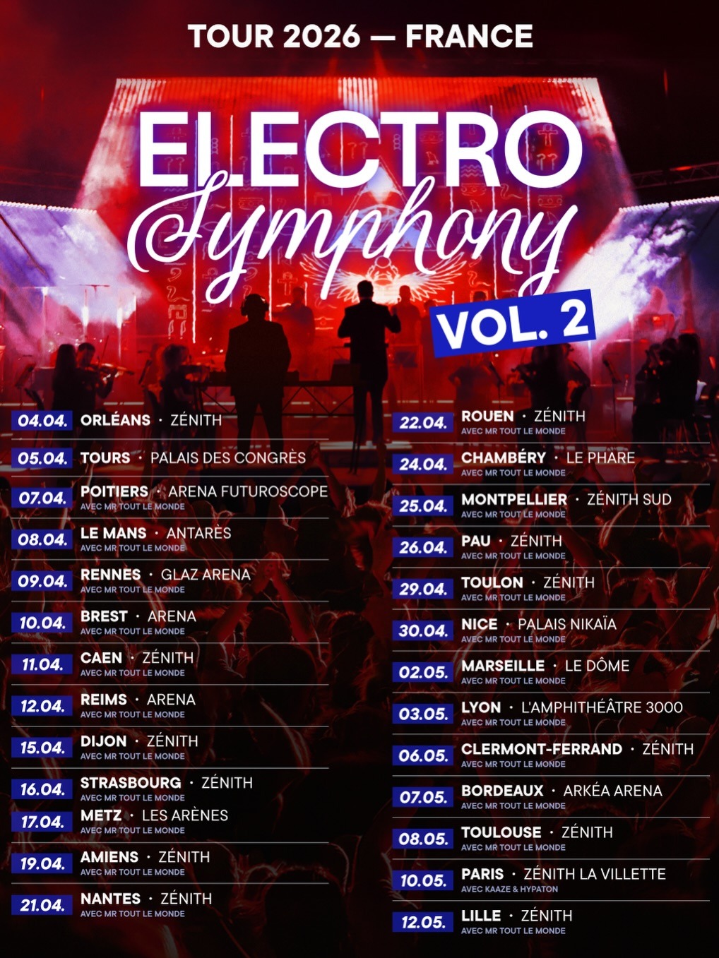 La tournée Electro Symphony, qui réinterprète les plus grands classiques de la musique électronique en version classique, continue ! Le 12 mai, elle sera de passage au Zénith de Lille, avec Mr Tout Le Monde en première partie. En mai, ils seront également de passage à Marseille, Toulouse ou encore Bordeaux.