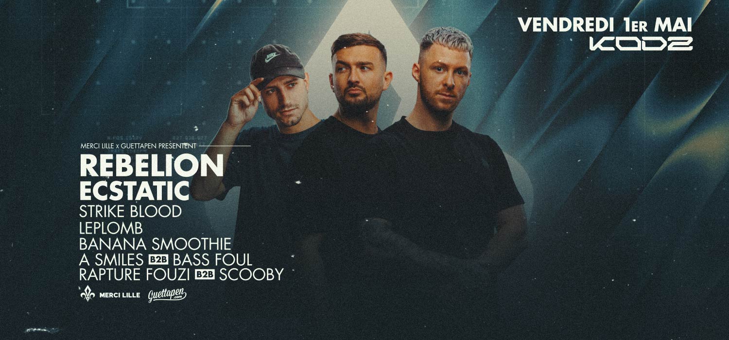 Les copains de Guettapen s’associent au collectif lillois Merci Lille et invitent Rebelion. Le KODZ d’Englos (proche Lille) va trembler sous les BPM du groupe écossais, mais aussi de l’étoile montante de la Hard Music : Excstatic. Il viendra nous régaler avec son Hardstyle « feel good », plus solaire et atmosphérique. En support de ces grands noms internationaux, on retrouvera le talentueux Strike Blood, fondateur du concept Hard Boat à Lyon, mais aussi Banana Smoothie, Leplomb, Scooby B2B Rapture et A-Smiles B2B Bass Foul.