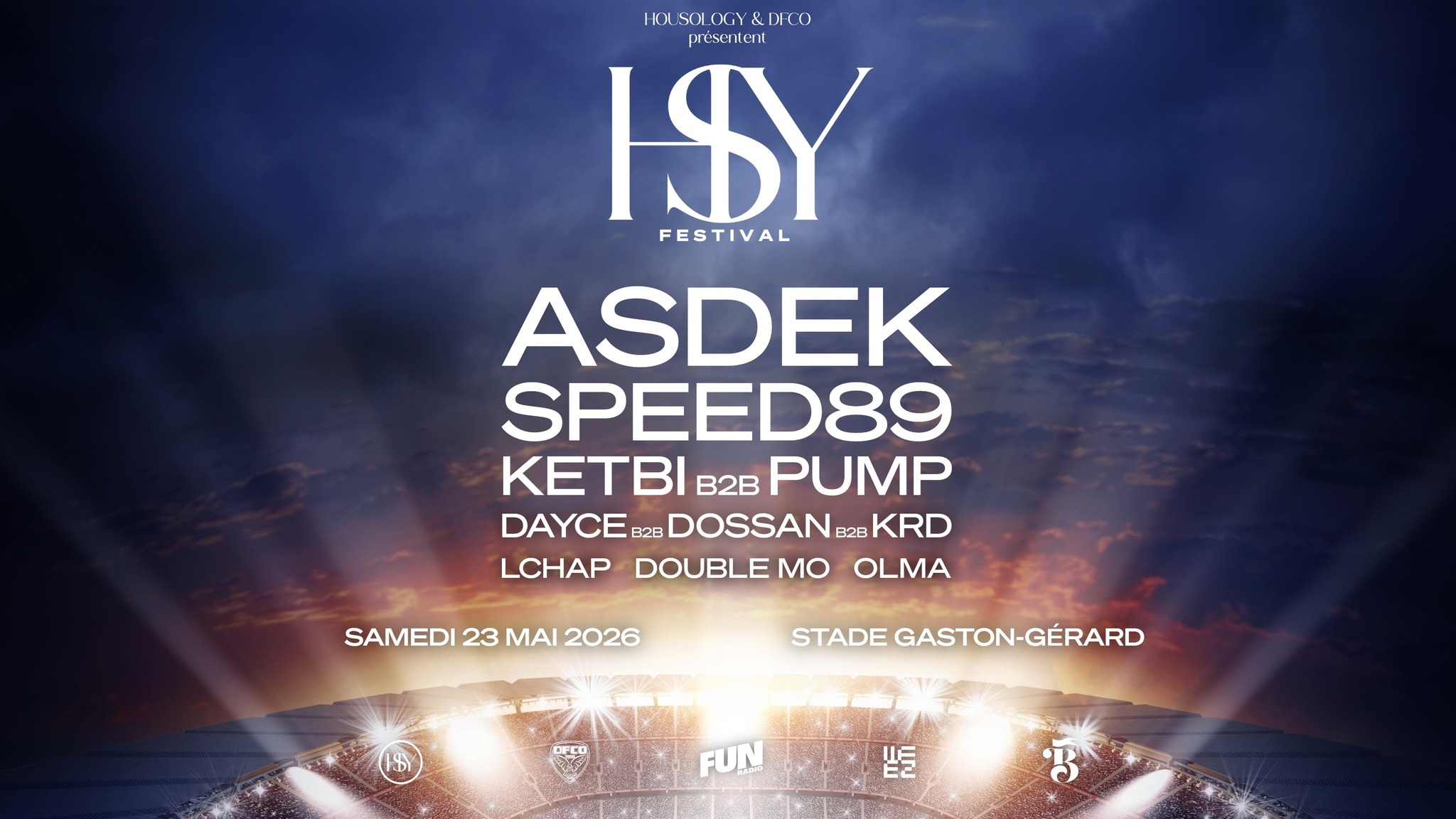 Housology & DFCO présentent : HSY FESTIVAL. Housology passe à l’étape supérieure. Depuis le début, le collectif construit son univers à travers dessoirées intenses, des clubs remplis et une communauté qui grandit à chaque événement. Mais cette fois, l’histoire prend une toute autre dimension. Cette fois, Housology voit plus grand. Beaucoup plus grand. Le rendez-vous se tiendra en bord de pelouse du stade Gaston-Gérard de Dijon, transformé pour l’occasion en véritable terrain dejeu pour la musique électronique. Une seule scène, un concept House to Techno, et 10 artistes qui se succéderont pour construire une montée en puissance musicale continue.
