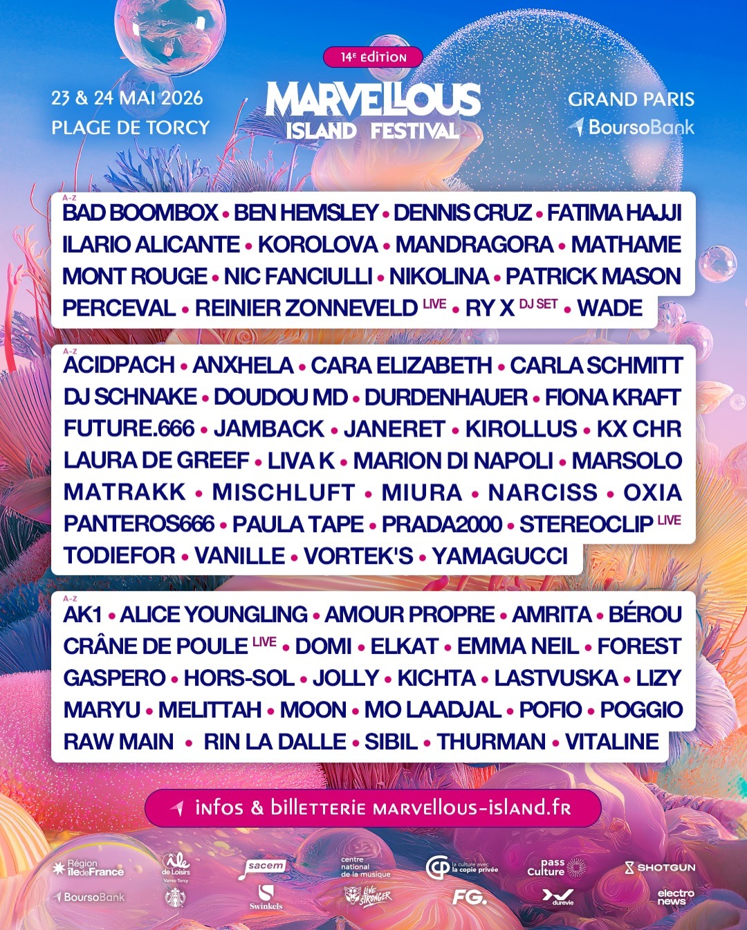 Bienvenue à Marvellous Island ! Oubliez la grisaille. Ici, tout est intense, saturé, vivant. Prêt·e à entrer dans une dimension où le rêve devient palpable. Le festival organise sa 14e édition, avec une programmation des plus alléchantes ! Et comme d’habitude : c’est une veille de lundi de pentecôte (férié).