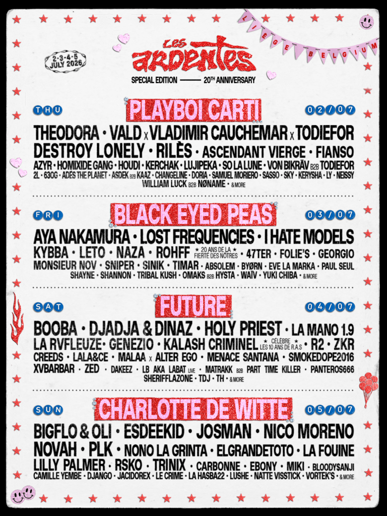 Le mythique Les Ardentes 2026 frappe fort pour ses 20 ans. Du 2 au 5 juillet 2026 à Liège, le plus grand festival hip-hop d’Europe dévoile une programmation complète à la hauteur de son statut : plus de 120 artistes, 4 scènes et près de 260 000 festivaliers attendus. Une édition anniversaire pensée comme un condensé de tout ce qui fait l’ADN des Ardentes : rap, pop, culture urbaine… mais aussi une place de plus en plus affirmée pour les musiques électroniques.