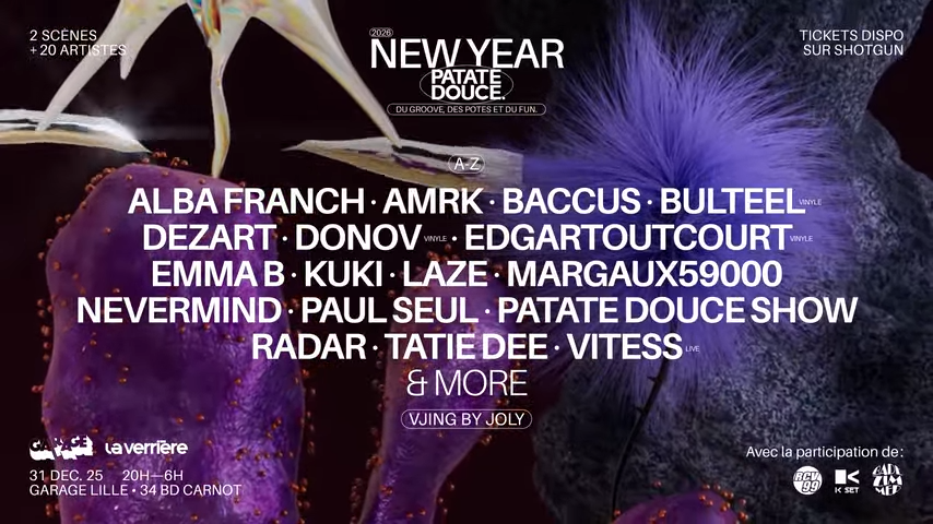 Et c’est déjà sa troisième édition ! Le collectif lillois Patate Douce compte célébrer la nouvelle année 2026 avec une soirée exceptionnelle, au sein de Garage. Le programme sera chargé : 1500m², plus de 15 artistes prêts à vous ambiancer, et surtout, la ferveur lillois !