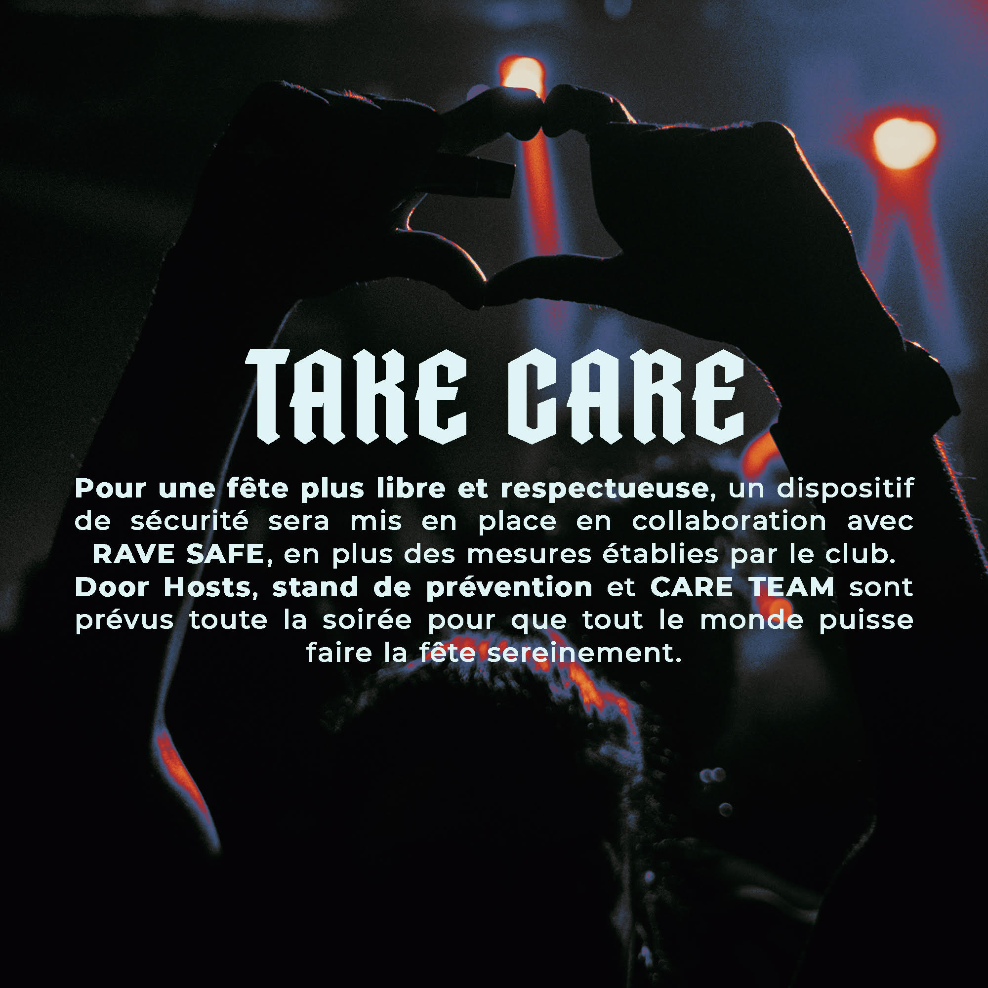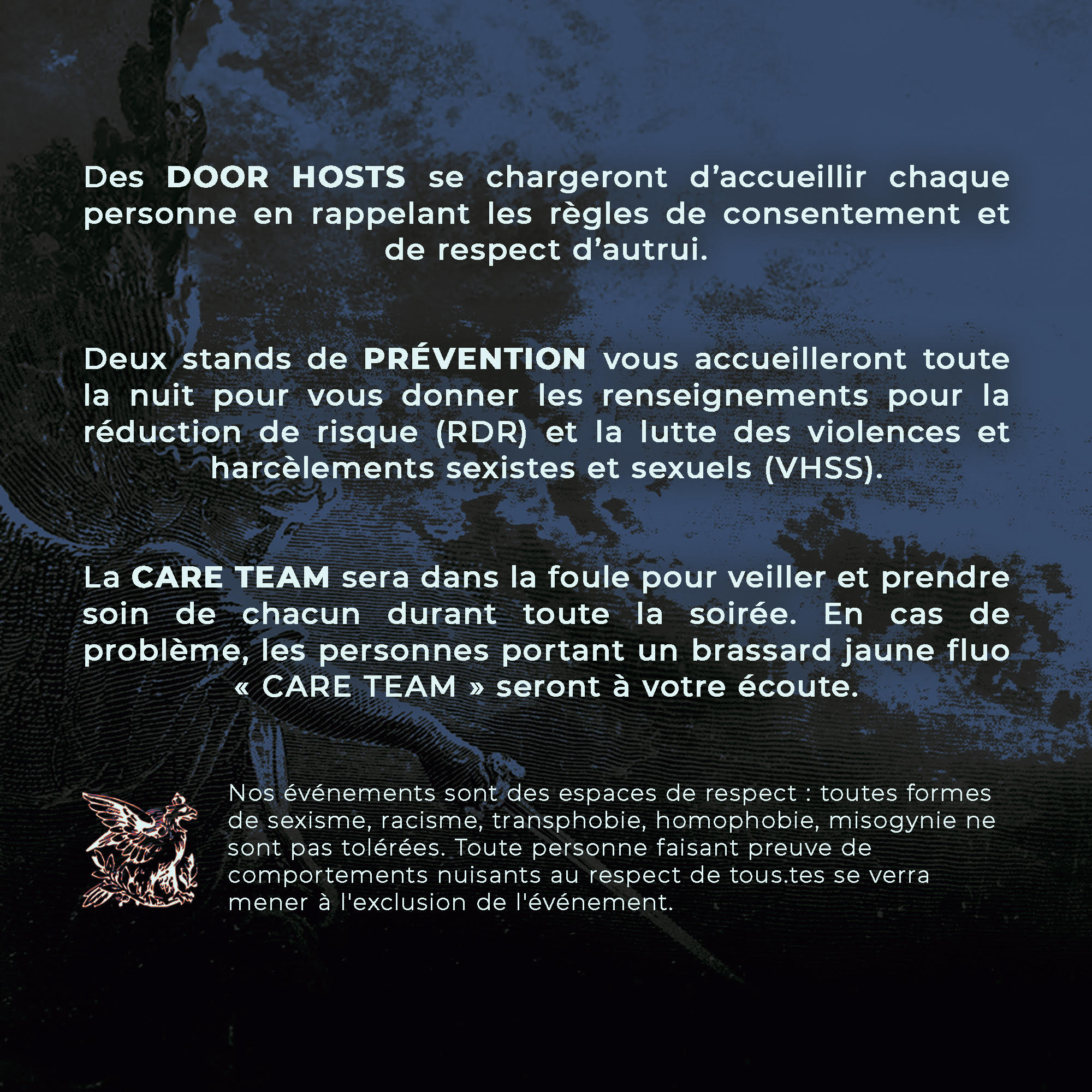 Et enfin, GRAVE se dote d’une équipe dédiée afin de rendre cette soirée inoubliable mais aussi respectueuse pour tout le monde. En plus des équipes du Nexus, des DOOR HOSTS et une CARE TEAM se chargeront de vous accueillir et permettre de rendre la soirée la plus mémorable et saine possible.