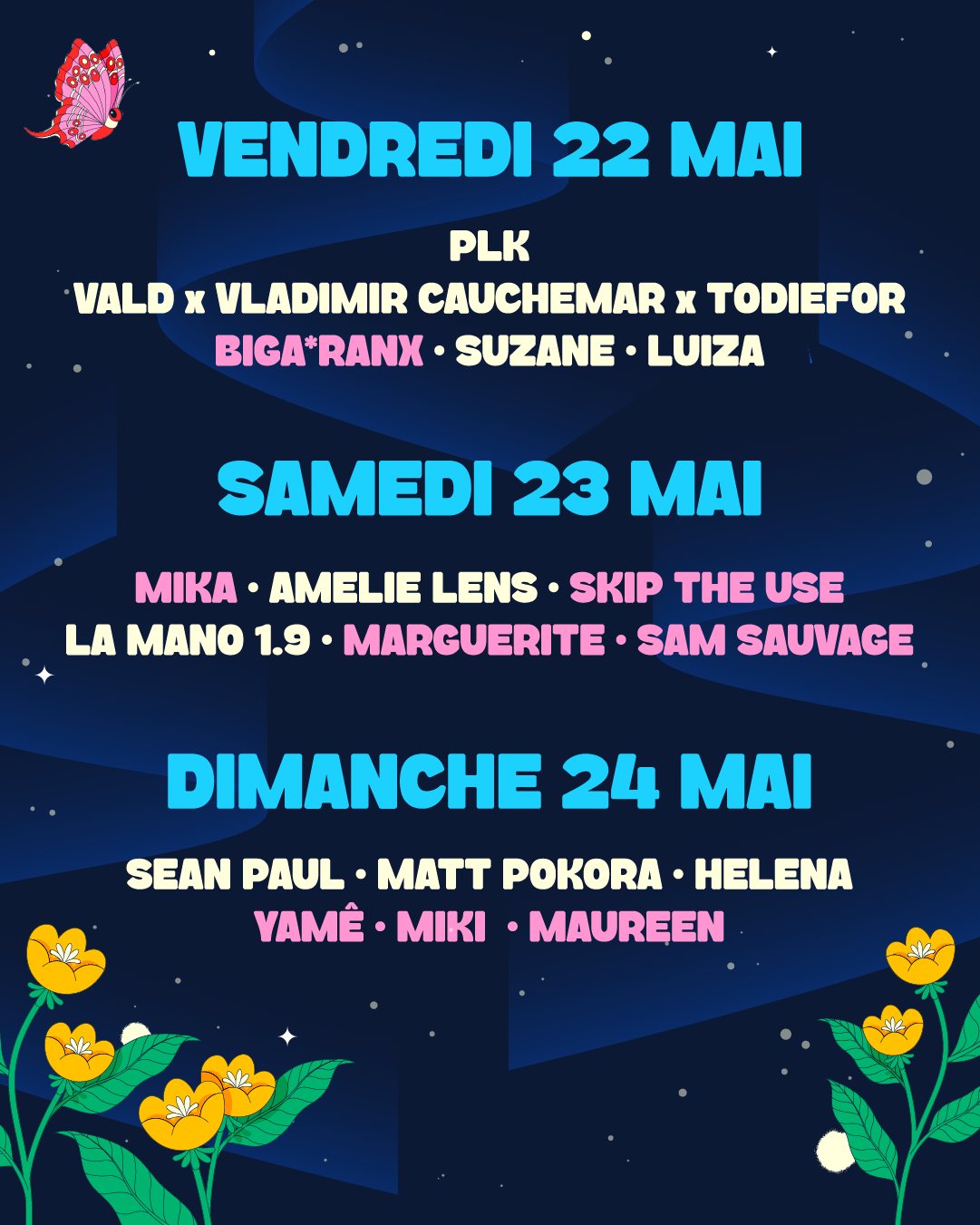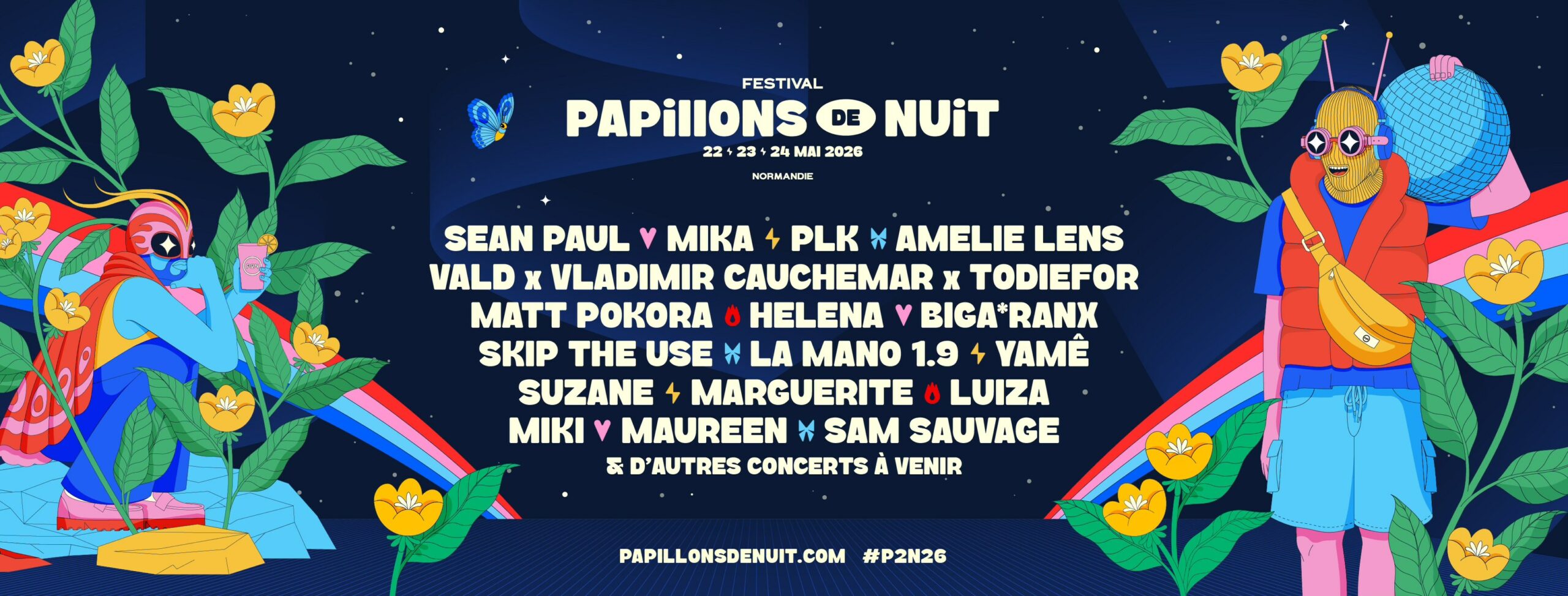 En tête d’affiche, on retrouvera notamment Mika, Sean Paul, PLK ou encore Matt Pokora. Les nouvelles têtes de la scène, comme Sam Sauvage, Miki, Marguerite, Héléna ou la sensation de l’été 2025 Luiza sont également sur la programmation. Côté électro, on retrouvera le représentant de la scène dub Biga*Ranx, ainsi que la reine de la techno Amelie Lens. Bien sûr, notre trio démonique Vald x Vladimir Cauchemar x Todiefor transformera le Papillons de Nuit 2026 en Pandemonium !