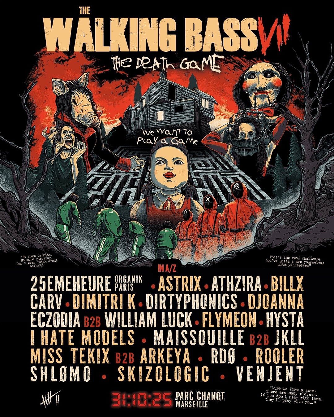 Walking Bass revient en 2025 avec un nouveau chapitre aussi déroutant qu’addictif. Trois nuits, trois lieux, un seul objectif : survivre au Death Game. La première manche débute le 30 octobre, avec une soirée 100 métal. Les choses sérieuses commencent le 31 octobre au parc Chanot, avec une montée en tension sonore. 20 000 participants sont attendus et devront survivre à ce line-up électrisant !