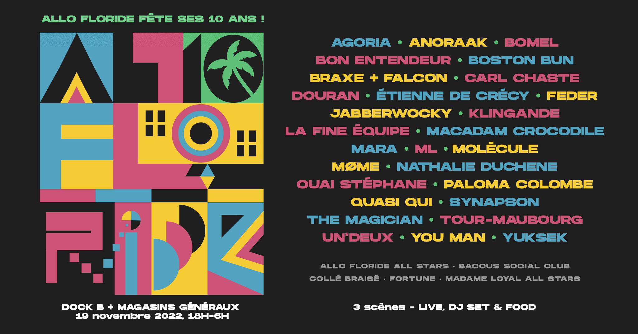 Chaque année, l’agence parisienne fête comme il se doit son anniversaire. Pour ses 10 ans, Allo Floride voit les choses en grand, et propose un line up IN-CROY-ABLE. Rendez-vous le 19 novembre à partir de 18h, au Dock B !