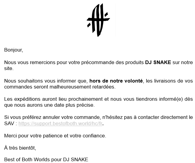 « Nomad » se retrouve donc sans date de sortie, le mercredi 3 septmebre. Soit 2 jours avant sa sortie officielle ! Aucun détail n’a été donné sur les raisons du report. Mais on peut aisément imaginer des litiges ou retard avec un autre artiste. C’était déjà la raison qui l’a poussé à ne pas sortir son album en 2024. Pour le moment, la date du report serait le 26 septembre, comme l’indique les revendeurs Fnac ou Amazon. Un mail a été envoyé aux personnes ayant pré-commandé l’album :