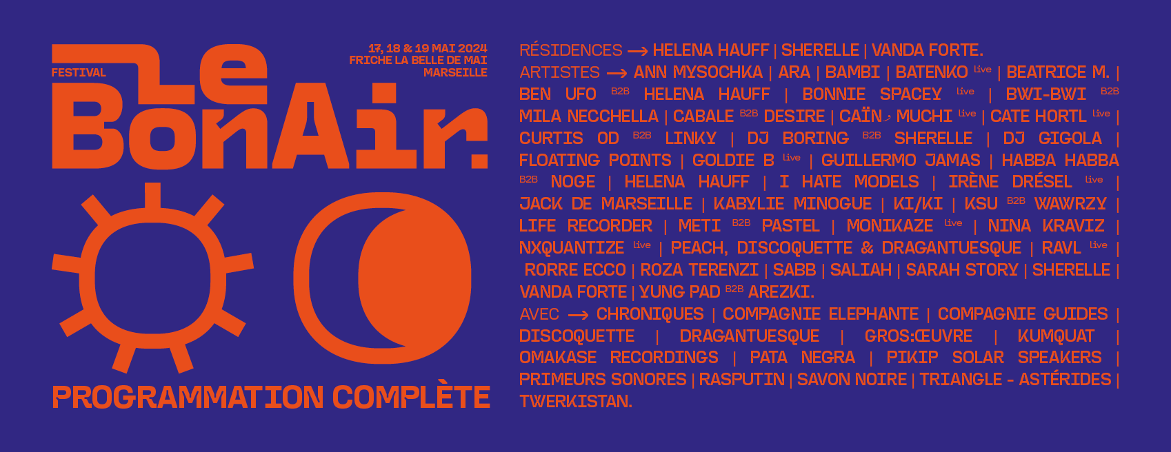 Ca bouge du côté de Marseille ! Le Bon Air revient pour une neuvième édition à la Friche de la Belle de Mai avec une programmation techno aux petits oignons. Le Festival viendra éveiller l’aube de l’été – tel un rituel, la veille d’un lundi férié – du 26 au 28 mai 2023 pour trois nuits & deux jours. Une seule boussole pour nous guider : cap sur les dancefloors, avec une envie trépidante de vous retrouver, prendre soin des moindres recoins, créer, explorer et affirmer encore plus fort. « Plus que jamais toute l’équipe est déterminée à mettre en lumière notre territoire, nos valeurs, nos cultures ! », ça promet donc !