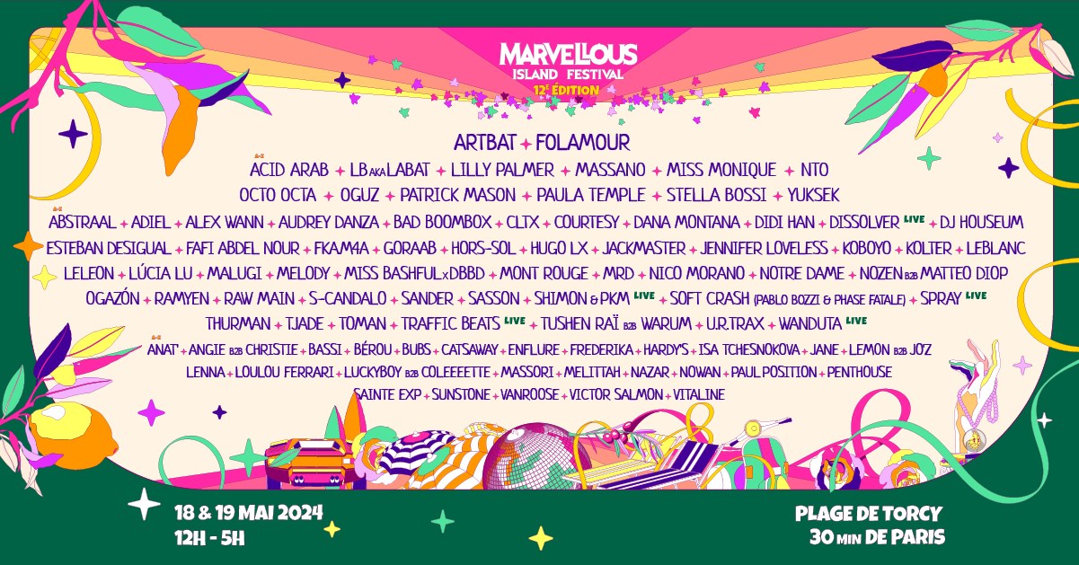 Comme à son habitude depuis 12 ans maintenant, Marvellous Island va voir le jour pendant le mois de mai, pour profiter du soleil. Bonne nouvelle pour 2024, le festival électro aura une scène supplémentaire ! L’évènement se déroule sur la plage de Torcy, à seulement 30 minutes de Paris, pour une ambiance de folie ! Le début de programmation est à tomber, couvrant de nombreux styles : Techno, House, Afro House, Melodic Techno ou encore Hard Techno ! Au niveau des artistes, Folamour, Lilly Palmer, Paula Temple ou encore Miss Monique sont déjà annoncés !