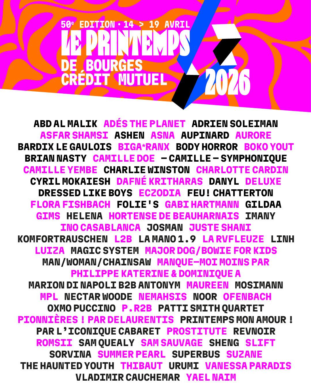 Du 14 au 19 avril 2026, 130 artistes illumineront la 50e édition du premier festival des musiques actuelles ! Une édition anniversaire durant laquelle toute la ville de Bourges, transformée en festival à ciel ouvert, vibrera au rythme d’une programmation riche et pleine de surprises Emergence, création, diversité, partage et esprit de fête : rendez-vous au Printemps de Bourges Crédit Mutuel !