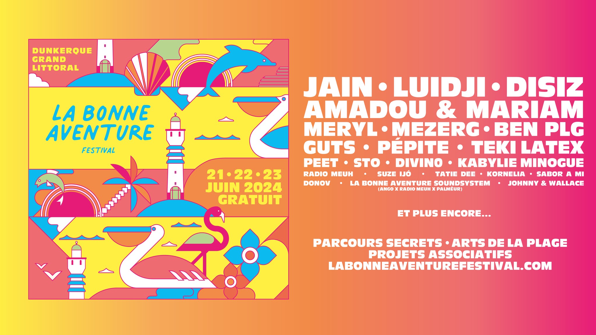 Le festival de La Bonne Aventure 2024 se déroulera une nouvelle fois à Dunkerque, sur la plage de Malo-les-Bains, du 21 au 23 juin. Ce festival est totalement gratuit, et propose une programmation variée et éclectique, mêlant concerts, arts de la plage, ateliers, et parcours secrets. Mais un parcours secret, qu’est ce que c’est ? Il s’agit d’une balade à vélo, avec un concert avec un artiste secret, dans un lieu inédit. Deux sont proposés cette année, le cosmique et l’océan, pour un billet à 10€ !