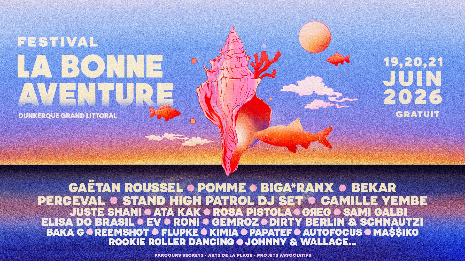 Du sable, du vent, et des kicks qui résonnent face à la mer. Pas de doute, le festival La Bonne Aventure revient du 19 au 21 juin 2026 sur la digue de Malo-les-Bains ! Toujours gratuit, toujours ouvert à tous, l’événement porté par Les Nuits Secrètes s’impose comme un rendez-vous à part, entre concerts, art contemporain et expérience à ciel ouvert. La programmation a par ailleurs été dévoilé ! On pourra retrouver à Dunkerque Gaëtan Roussel, Pomme, le rappeur Bekar, ou encore Biga*Ranx qui viendra illuminer la digue !